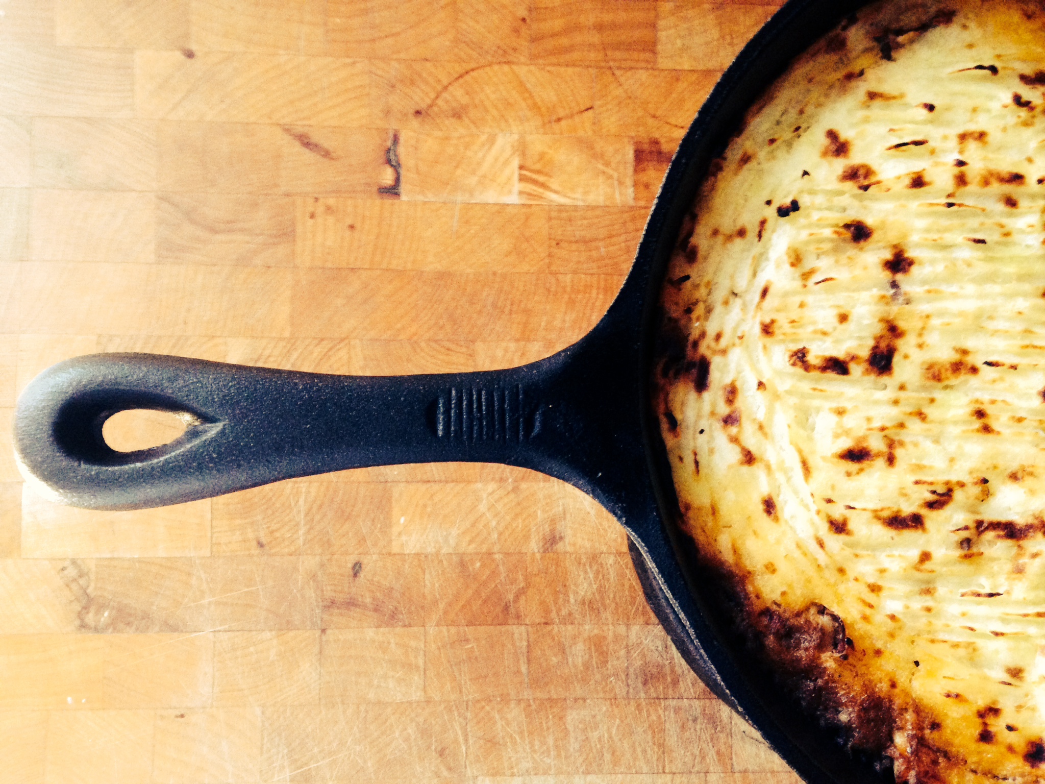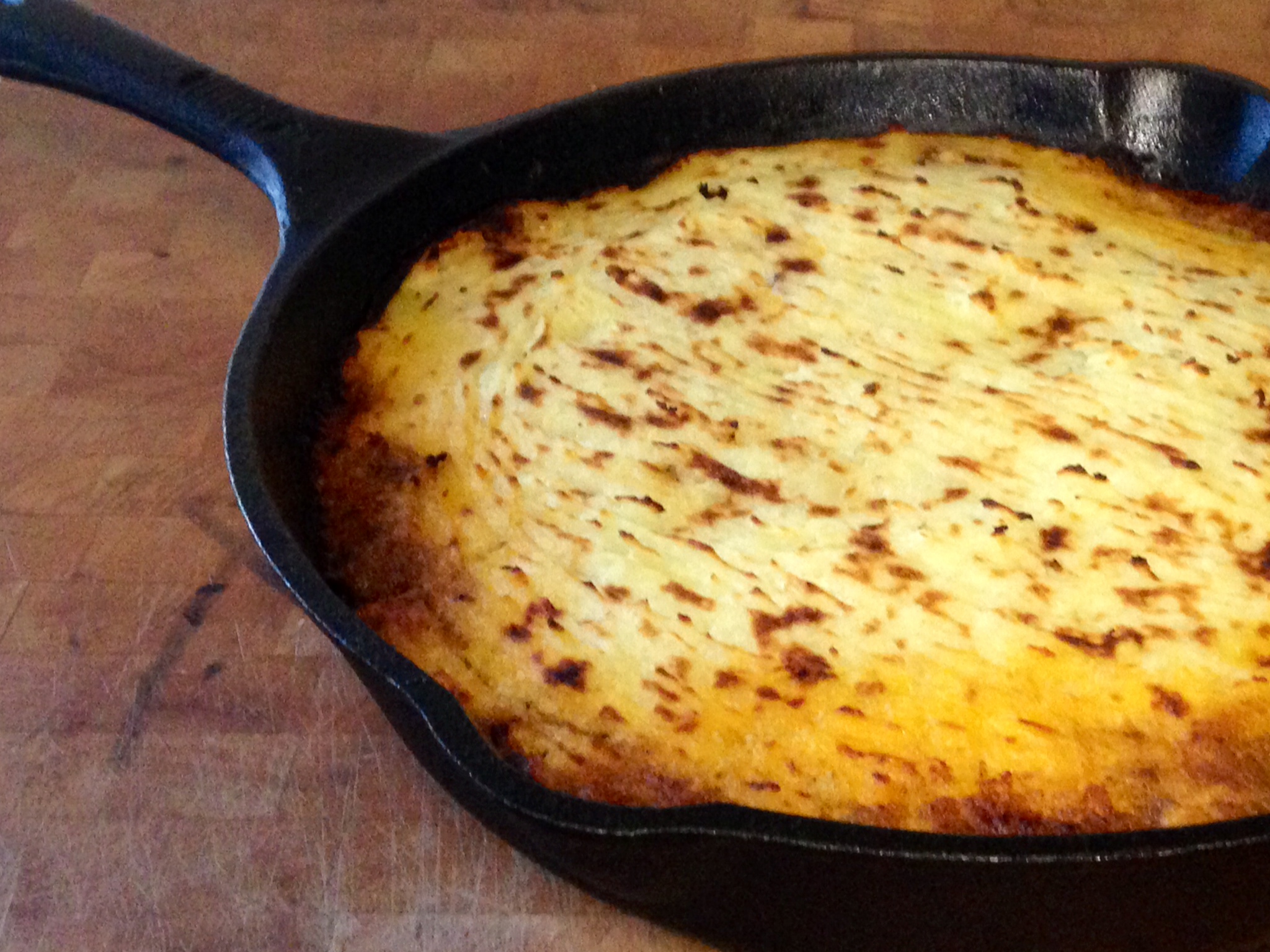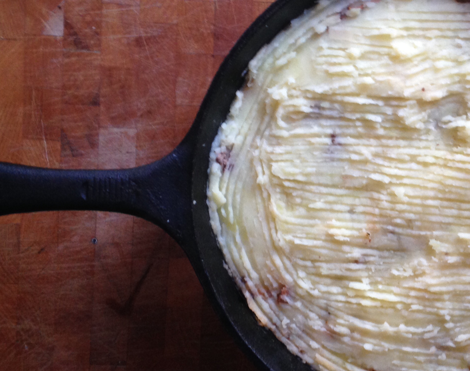 Meanwhile, test the potatoes with a fork. When they are cooked through remove one ladle of water from pot and set aside. Remove pot from heat and strain. Add 1-2 tbsp butter (more is of course better), a pinch of salt and mash with a potato masher or mixer ladling the water back in. Add the sage to the meat mixture, remove from heat when sauce is ready. Give it a taste and season as needed. Use a spatula to spread whipped potatoes over meat in skillet. I like to use a fork to make lines through the potatoes. Bake in oven for 20 minutes, turn the broiler on high which should quickly brown the top. Remove from oven and let rest for 10 minutes before serving.