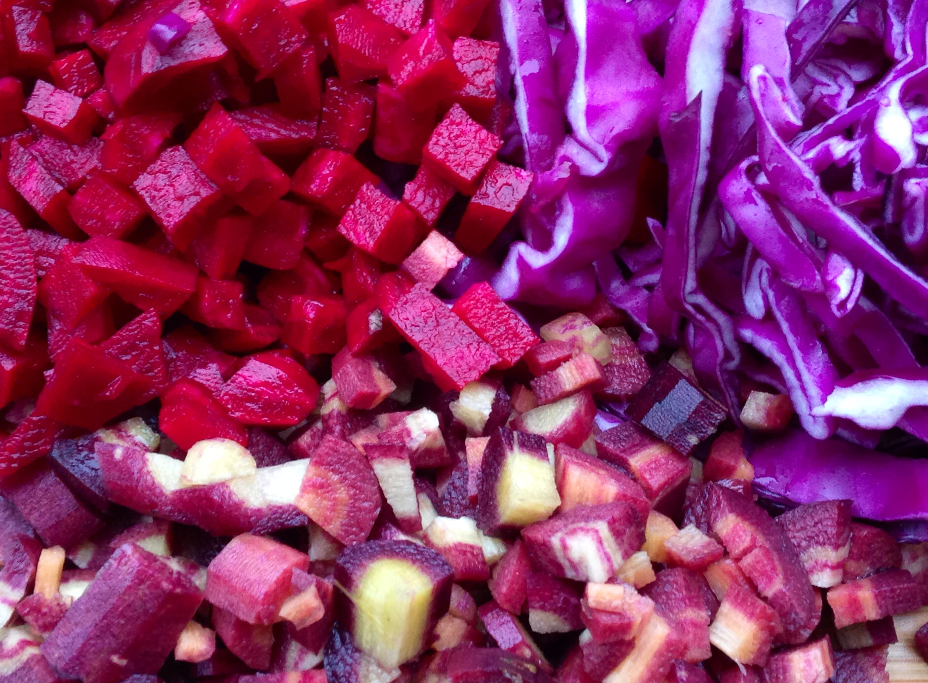 Wash vegetables, clean jars and utensils. Chop head of cabbage into 4 sections, remove core stem section. Next chop the cabbage in whatever way works for you, A kitchen knife, box grater, mandoline, or food processor will work. It really helps the recipe to get the cabbage sliced thin. Peel and chop beet and carrot into small cube sized pieces. Mince Garlic cloves. Add cabbage to salad bowl and sprinkle 2 tbsp of salt on top. Work the cabbage like you would knead dough. Its important to spend several minutes really kneading and squeezing to break down the cabbage and allow it to release its juices. I have found that the thinner the cabbage is sliced the easier it is to render its juices. Mix in the rest of veggies and let sit for 30 minutes. Next, pack the vegetables into a clean canning jar. Use the back of a spoon to really pack the mix down to remove air pockets and allow the water level to come up. The liquid should cover the top of the vegetables. If it doesn’t quite make it add a little cold water. It is a good idea to have a 2nd small canning jar ready in case you need a little extra space. If you are not feeling sure about fermentation just put the jar directly into the fridge, its quite healthy already. Otherwise, close lid and store in a cool dark place at or below room temperature. Check the probiotic after 3-4 days by opening the lid to release pressure (burp lids). Make sure all vegetables are below the liquid surface, pick out any that are sticking up. Give it a taste, the probiotic should be slowly taking on a mild tangy sour taste. Check it again at 3-4 day intervals for up to 2 weeks. It can be refrigerated and eaten after just 3 days if reaches your desired taste, but 10-14 days will allow more probiotic activity to take place. When ready put jar in fridge at which point fermentation will stop and it will be ready to store and eat for months. The Purple Pickled Probiotic will retain its crunchy texture and take on a salty sour flavor, delicious! Once you get the hang of this process feel free to experiment with new combinations. There are numerous recipes and ingredients that have been fermented in this way.