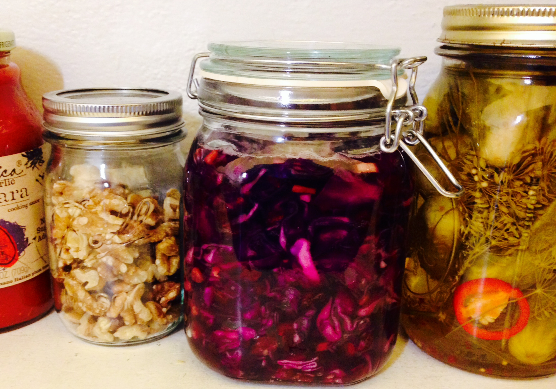 Fermented foods first came across my radar about a decade ago, at the time they were more of a novelty item but have since become very popular and are well represented in grocery stores. This is definitely not a new way to prepare and eat food, it has simply been missing from the modern diet for awhile. The overall health of our stomachs will no doubt benefit from its return. Its very likely that our sterile diet due to widespread pasteurization of our food has contributed to gut flora imbalances. The stomach is colonized by bacteria, but eliminating all bacteria from the diet including the (Lactobacillus) beneficial bacteria leaves the door open for any bacteria to move in and occupy this space. Fermented food products are fairly expensive in stores but are really easy and cheap to make at home. This is my simple fermented vegetable recipe, and its easier to make than saying Purple Pickled Probiotic 3 times. I like to use purple vegetables because they are loaded with vitamins A, C, E, B-6, antioxidants, including lycopene, beta carotene, the purple vegetable super antioxidant anthocyanins, and much, much more. Good stuff for cold and flu season.