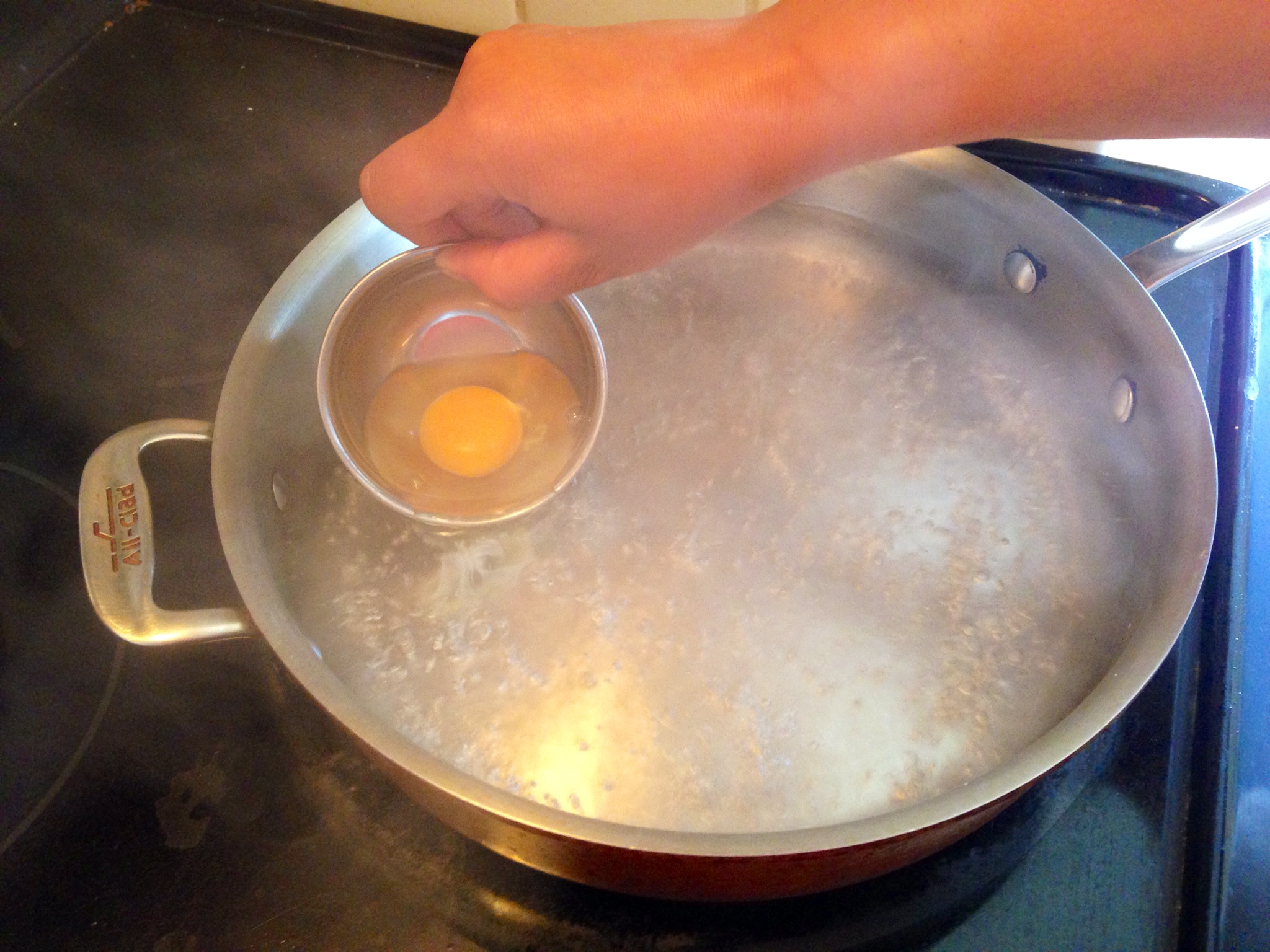 The vegetables can be prepared in two ways. When I have young vegetables I like to cook them whole but with full sized vegetables it’s better to chop them up into dice-sized pieces and make something resembling a hash out of them. The whole vegetables of course take a little longer to cook so if using whole veggies chop the potatoes, carrots, and asparagus ahead of time. Chop a clove of garlic into thin slices. Two eggs per person and about 4 each of asparagus, baby potatoes, and baby carrots seems to be sufficient. Add ghee or butter to a large skillet and turn burner to med-high. Off to the side fill a deep-sided pan with water and add a glug of vinegar. Add potatoes to heated butter and if using whole potatoes, poke each once with a fork first. After about five minutes, turn heat down to medium and continue to cook, shaking pan every so often. When potatoes become slightly tender add the carrots, and a few minutes later add the asparagus and a shake of salt. When the carrots and asparagus begin to turn a nice brown color add peas and garlic. Turn heat down a little more and make sure everything has softened before removing from heat and adding to plates. For the perfect poached eggs turn already heated burner to high and slide second pan with water and vinegar onto it. Crack an egg into the smallest bowl you can find.  When water just begins to reach a boil, carefully slide egg into the rolling water (like an old man sliding into a bathtub). Crack next egg into small bowl and repeat working clockwise around the pan (this helps keep track of cooking times). It may seem that the eggs are a mess at first but they always come back together. Overall cooking time depends on personal preference, but about two minutes seems to be a good bench mark before turning them over. Next use a slotted spoon to flip each in order they were put into pan. Cook about one minute more and remove with slotted spoon and set each on kitchen towel to dry for a minute. Place each egg on top of vegetables, slice open and salt n pepper ’em.