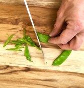 Next, slice the peas from tip to tail, turning the knife to a slight angle. When you chop the peas this way you get nice slices and the peas with spill out.