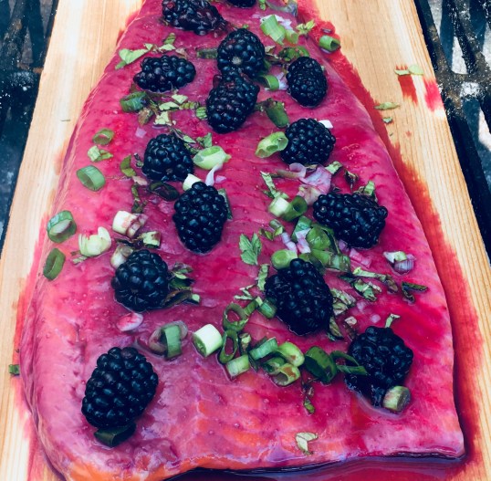 One of my culinary interests is using ingredients collected from the same place, or even all wild ingredients. It’s also exciting to imagine what native people would have prepared with no grocery store and only the rivers, fields, forest and garden to shop. Now this is not necessarily a native American recipe but it could be similar to something they may have prepared as berries and herbs were commonly used to season fish and game. Blackberries, wild mint and wild onions are all common foraging foods but of course you know where else to find the tame versions of these plants in the garden or grocery store. Salmon can be and often is seasoned numerous ways, but to be honest I almost never use any other seasoning other than salt or maybe a sprig of rosemary or a lemon slice from time to time. Its pretty infrequent that I really build up this fish that really needs little to no extras as it is a perfect food all on its own. This recipe is an exception, where the salmon is dressed up with foodstuffs that are found on the land around the rivers where this fish is harvested.