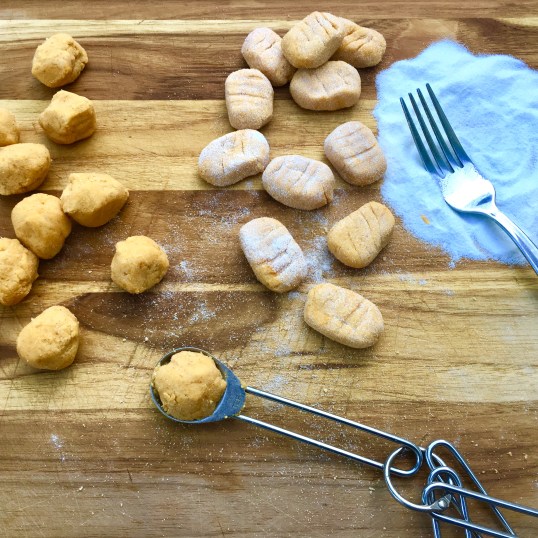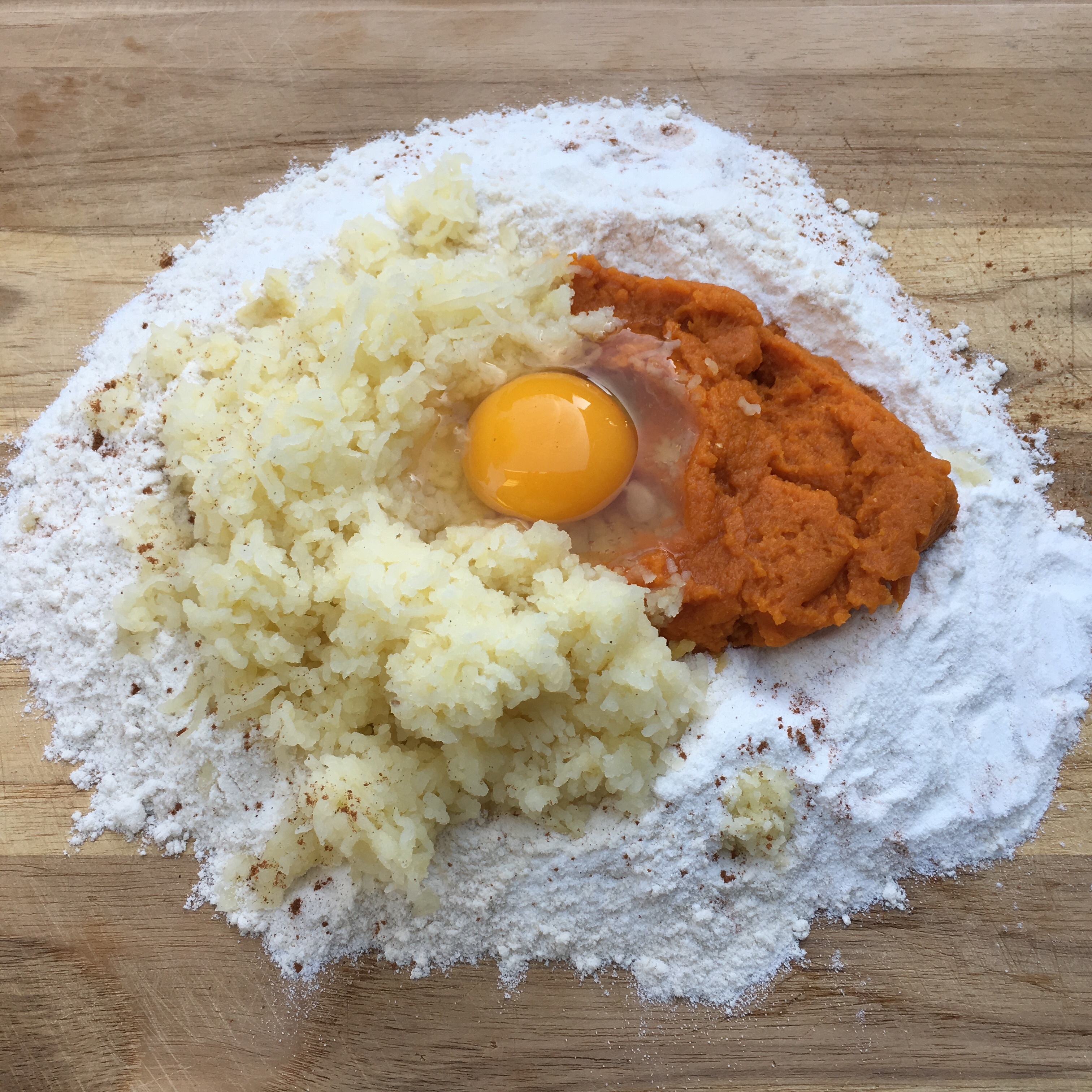 Add only 3/4 cup of each rice flour to a cutting board in a pile and sprinkle the cinnamon, nutmeg and salt over it. Sift with hand and then make a circular pile. Add in the grated potato to one side and the pumpkin puree to the other. Drop the egg in the middle and mix the dough with a fork, slowly bringing in flour from the outside in. When the mix begins to get crumbly, ditch the fork and begin mixing with hands, kneading like any other bread dough. We are looking for the consistency of bread or pizza dough which is soft and dense, not too sticky. Add more flour as necessary to keep dough from becoming sticky.
