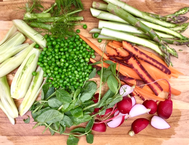 Make piles of each prepared vegetable on a cutting board. Shell peas, separate pea leaves, slice carrots from tip to tail (if they are large enough) as many times as possible to get strips, cut radishes in half or even quartered if they are larger, if asparagus is skinny leave them be, otherwise cut from tip to tail if they are bigger, cut fennel bulbs tops and butts off (save tops to garnish), then slice the bulbs across the middle enough times to produce several ½ inch slices.